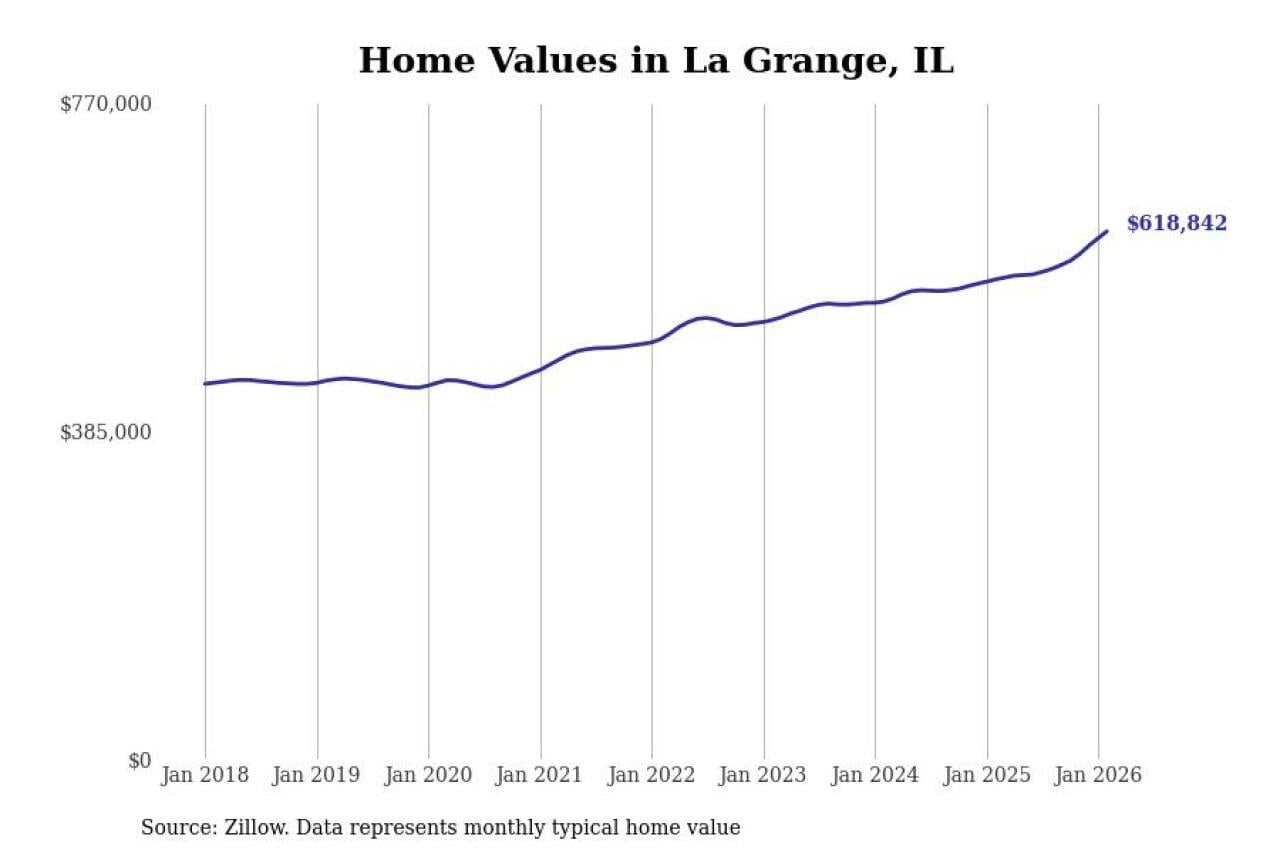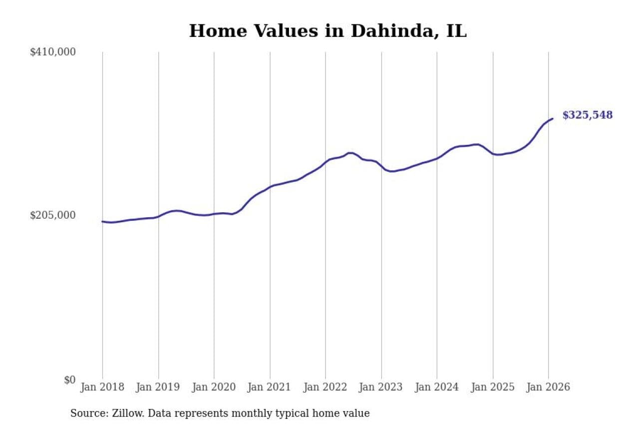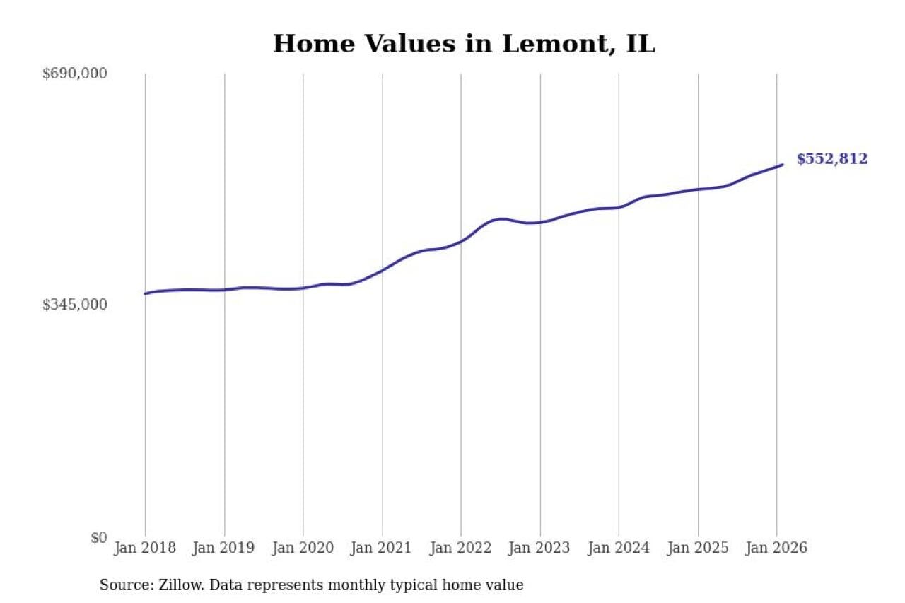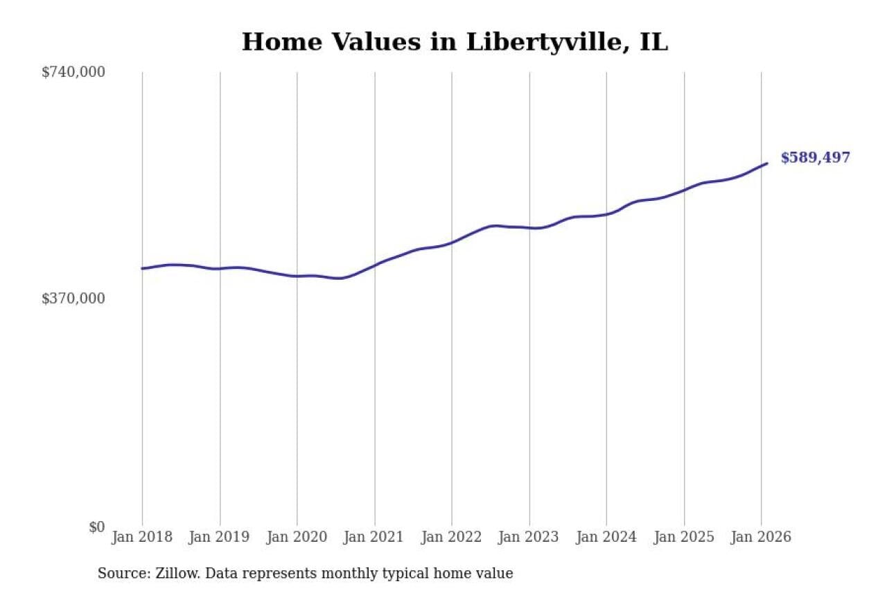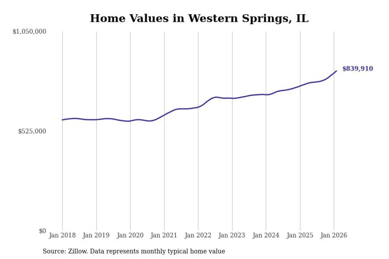 Stacker compiled a list of cities with the fastest-growing home prices in Illinois using data from Zillow. Cities are ranked by the dollar change in the Zillow Home Values Index for all homes from the 12 months ending February 2026. The charts in this story were created automatically using Matplotlib. Data was available for 50 cities and towns in Illinois.