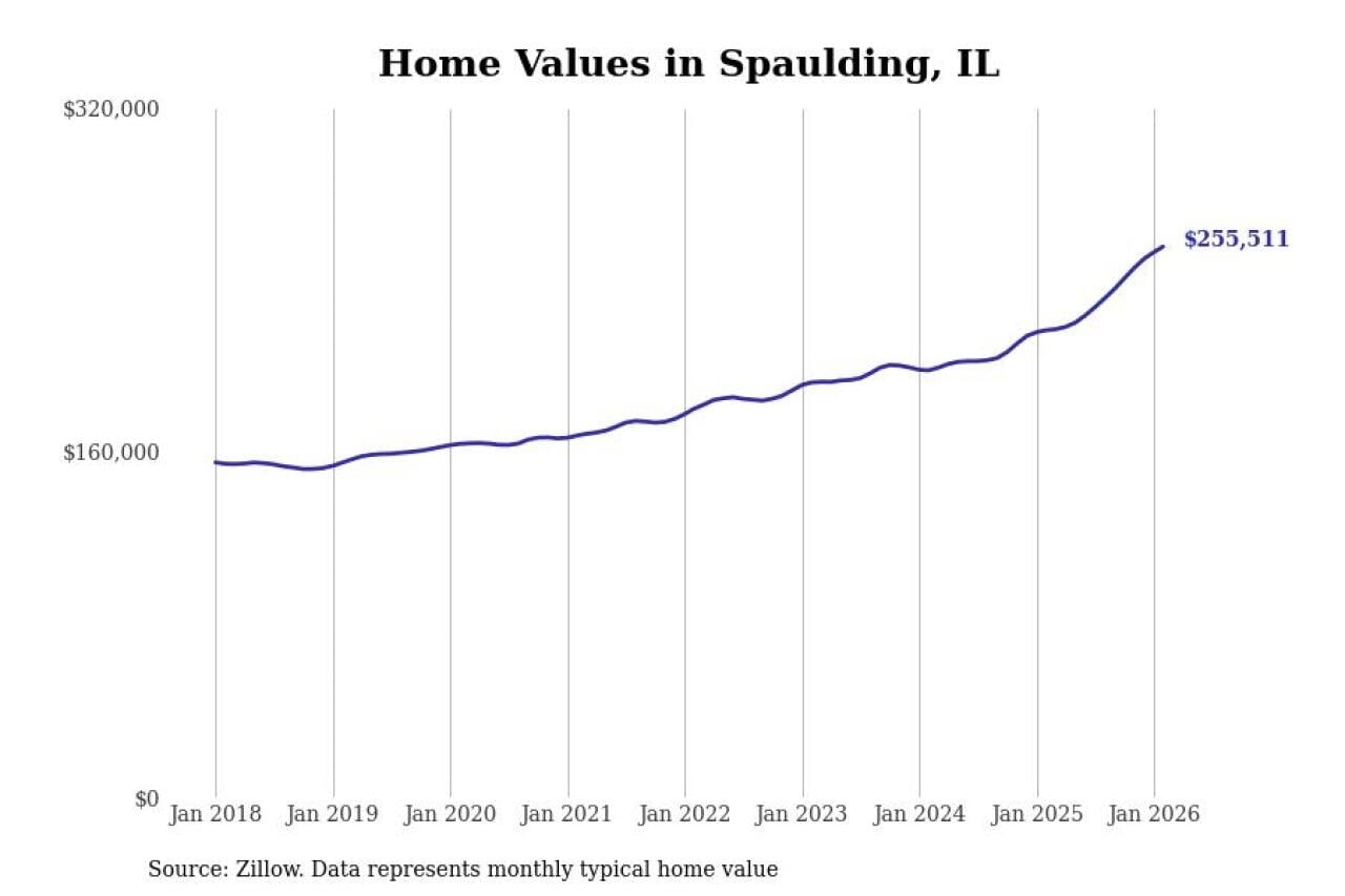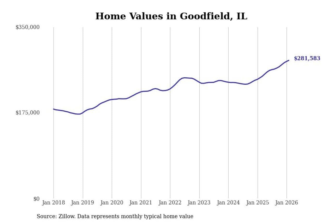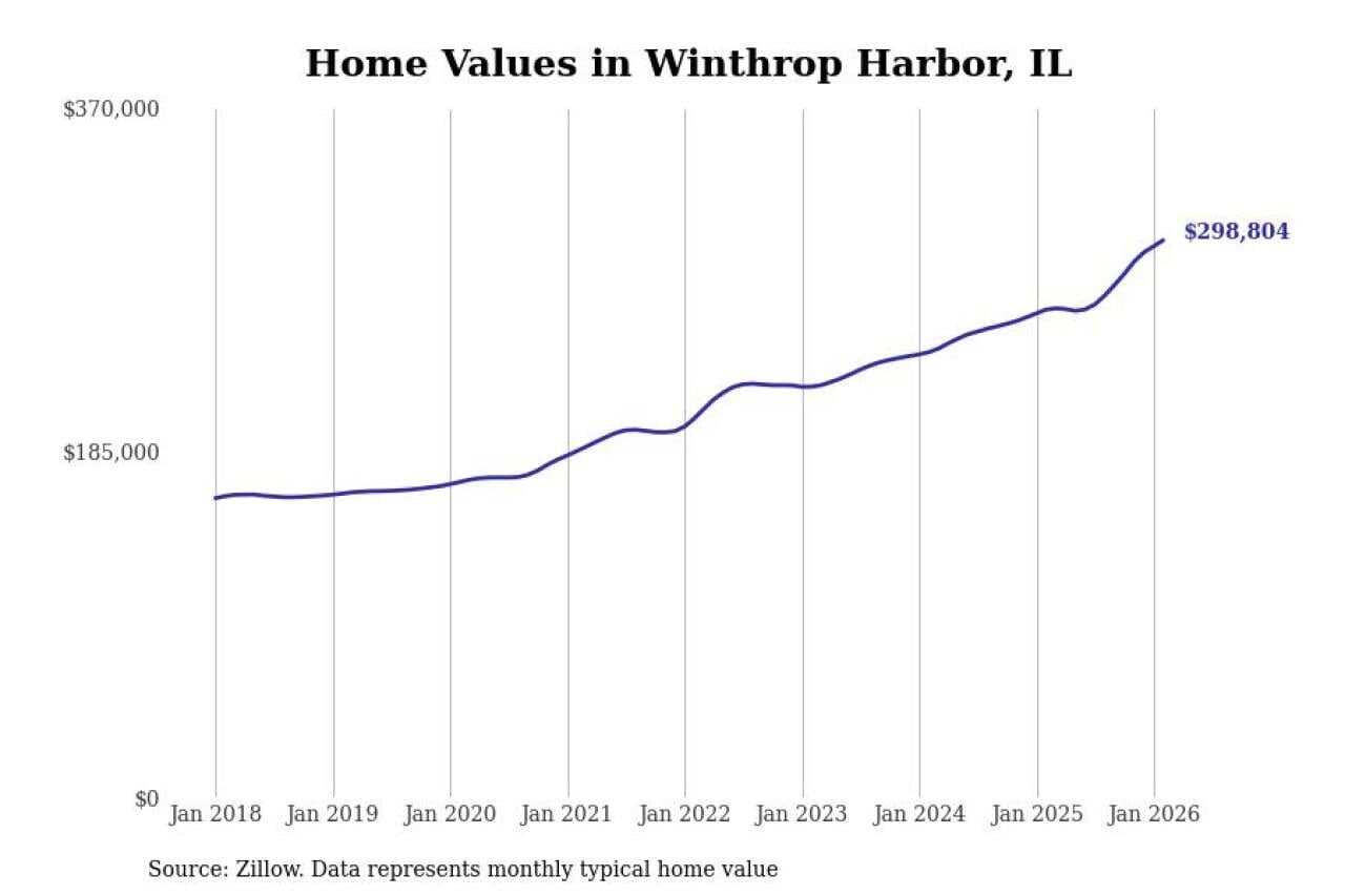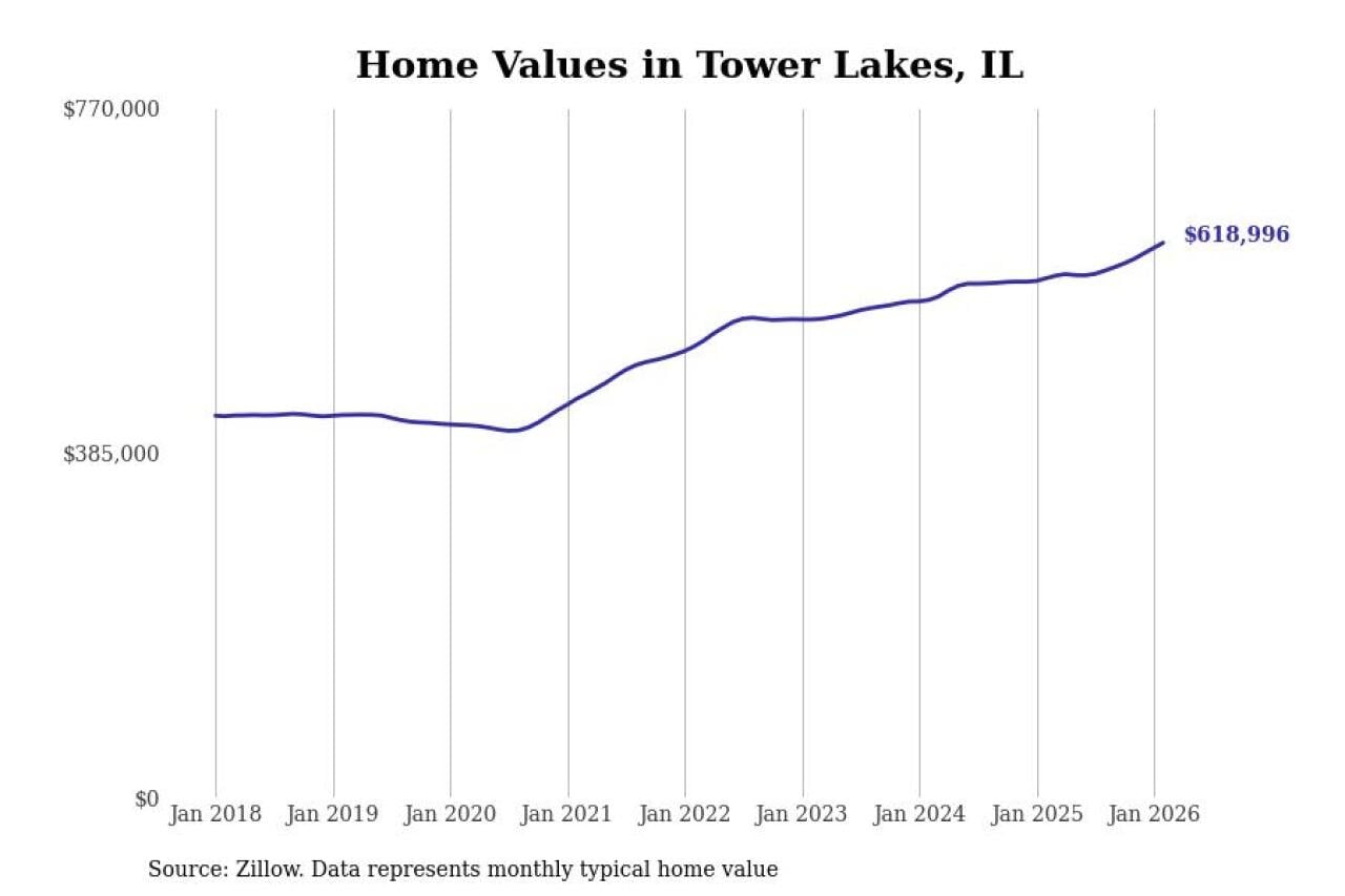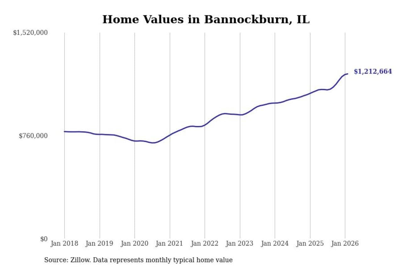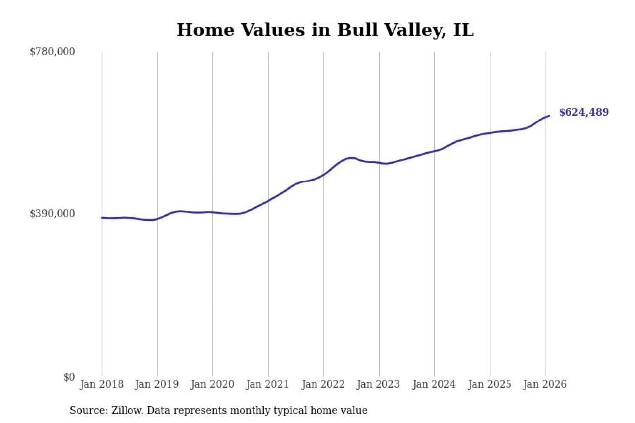 Stacker compiled a list of cities with the fastest-growing home prices in Illinois using data from Zillow. Cities are ranked by the dollar change in the Zillow Home Values Index for all homes from the 12 months ending February 2026. The charts in this story were created automatically using Matplotlib. Data was available for 50 cities and towns in Illinois.