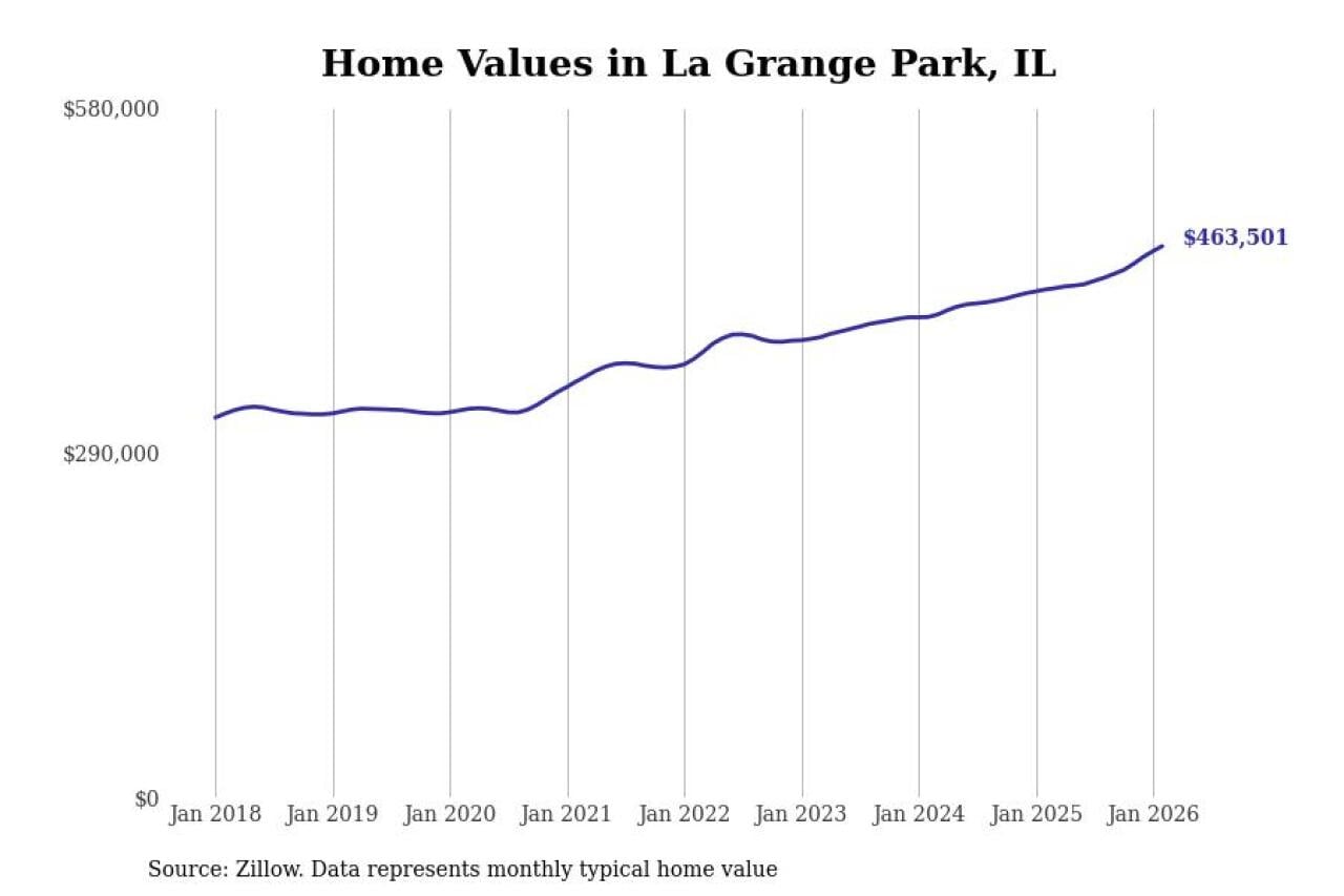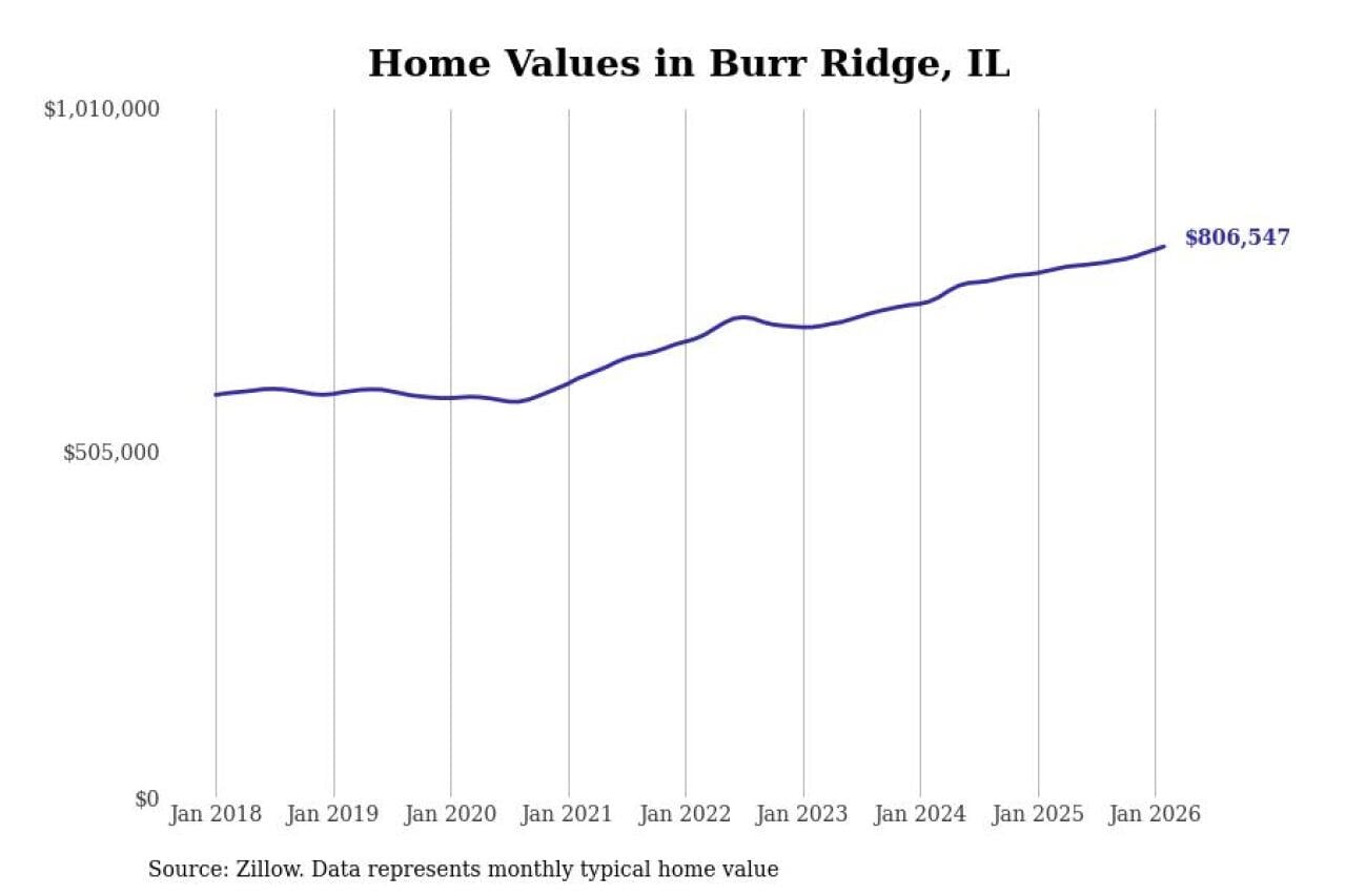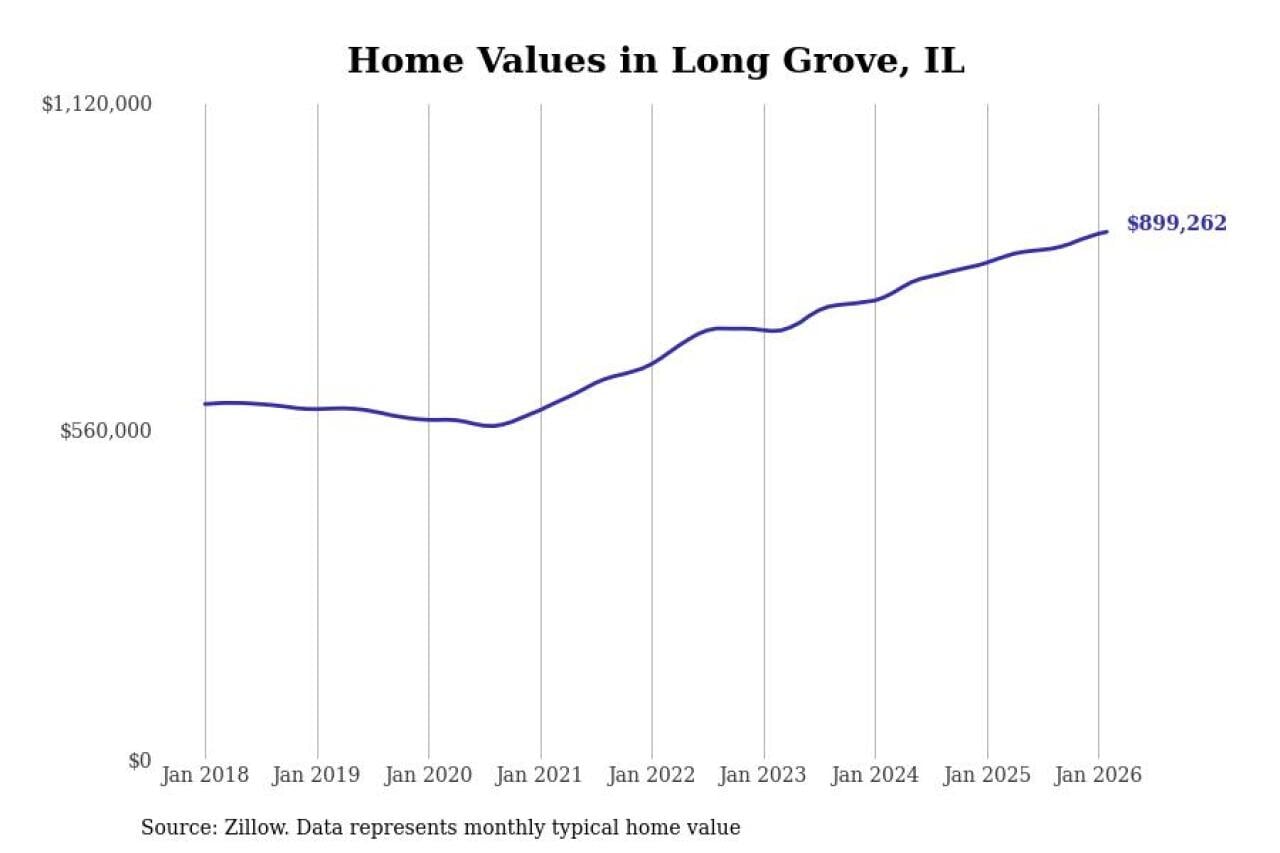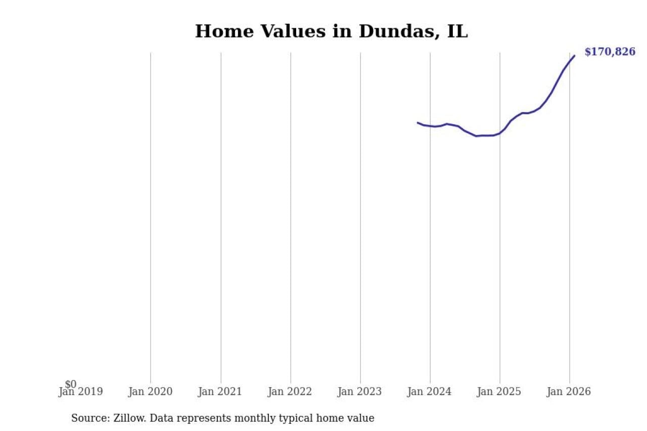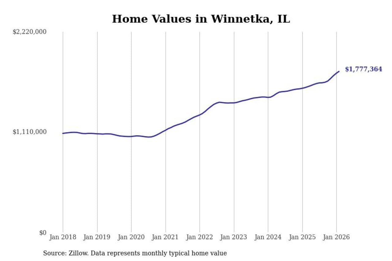 Stacker compiled a list of cities with the fastest-growing home prices in Illinois using data from Zillow. Cities are ranked by the dollar change in the Zillow Home Values Index for all homes from the 12 months ending February 2026. The charts in this story were created automatically using Matplotlib. Data was available for 50 cities and towns in Illinois.