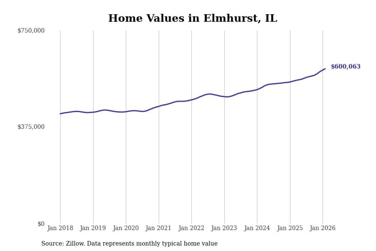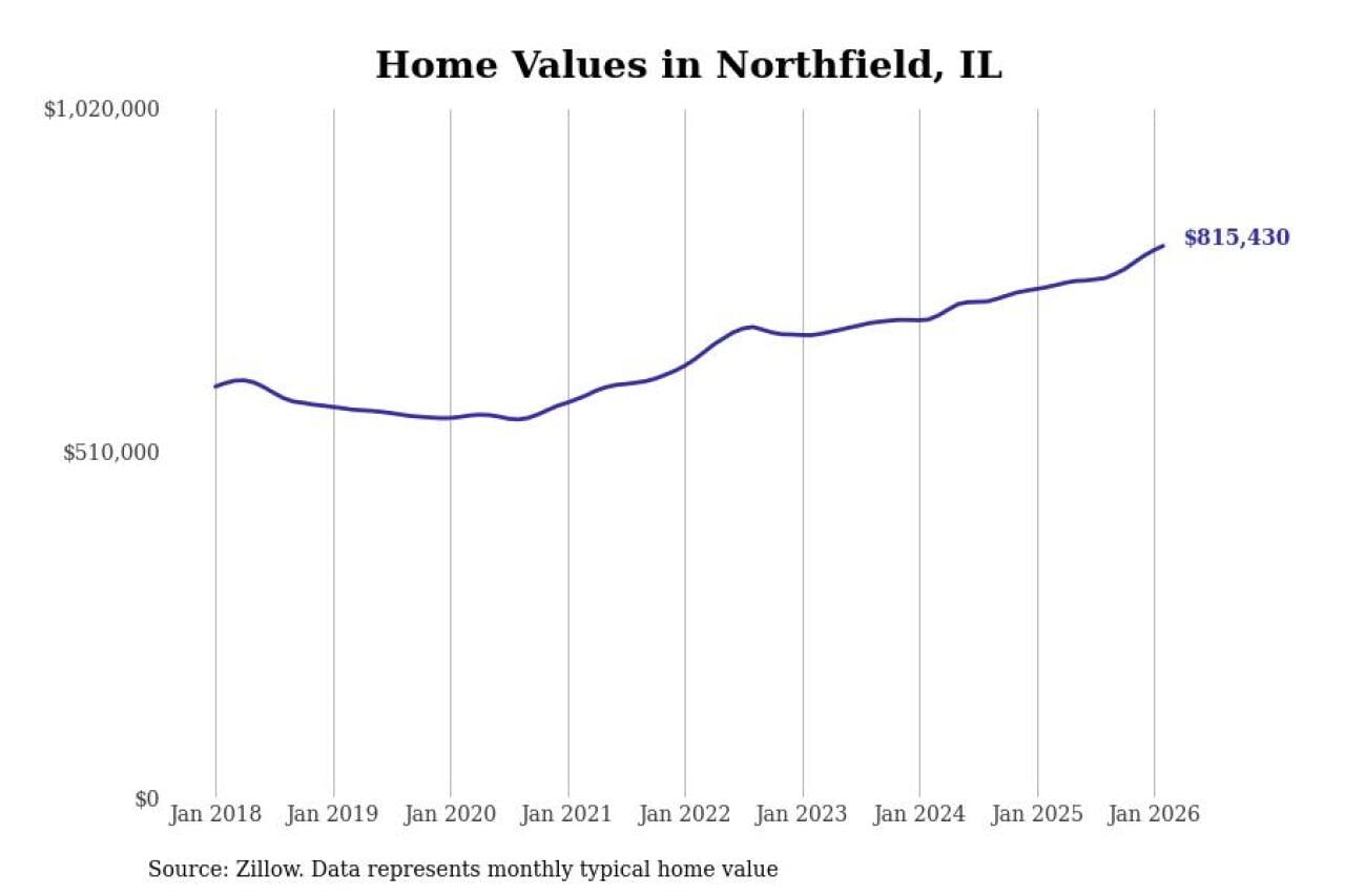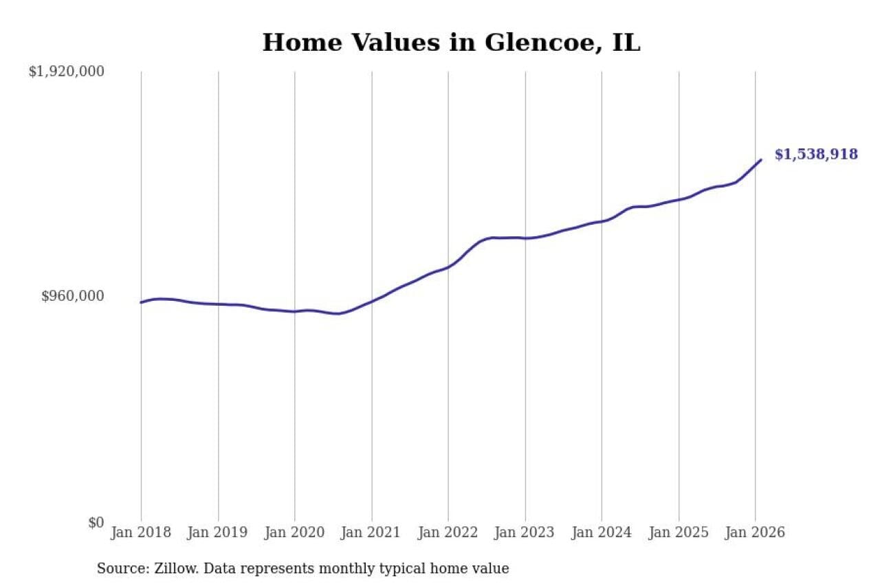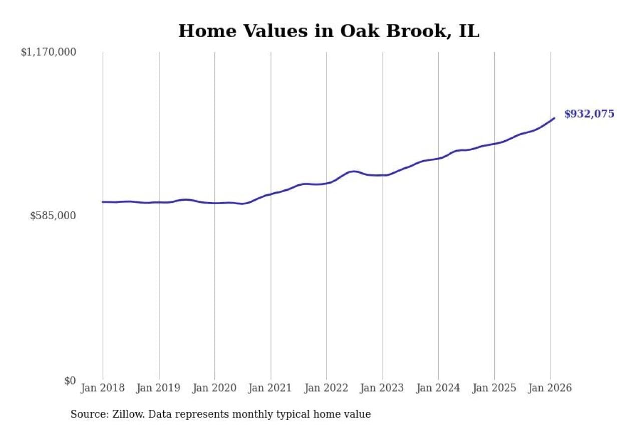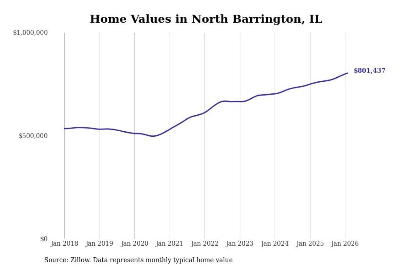 Stacker compiled a list of cities with the fastest-growing home prices in Illinois using data from Zillow. Cities are ranked by the dollar change in the Zillow Home Values Index for all homes from the 12 months ending February 2026. The charts in this story were created automatically using Matplotlib. Data was available for 50 cities and towns in Illinois.