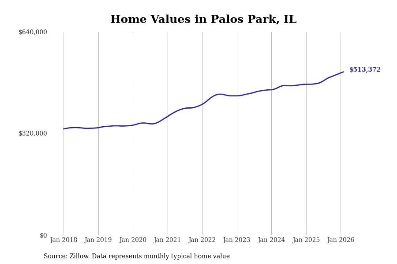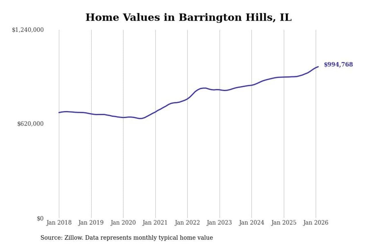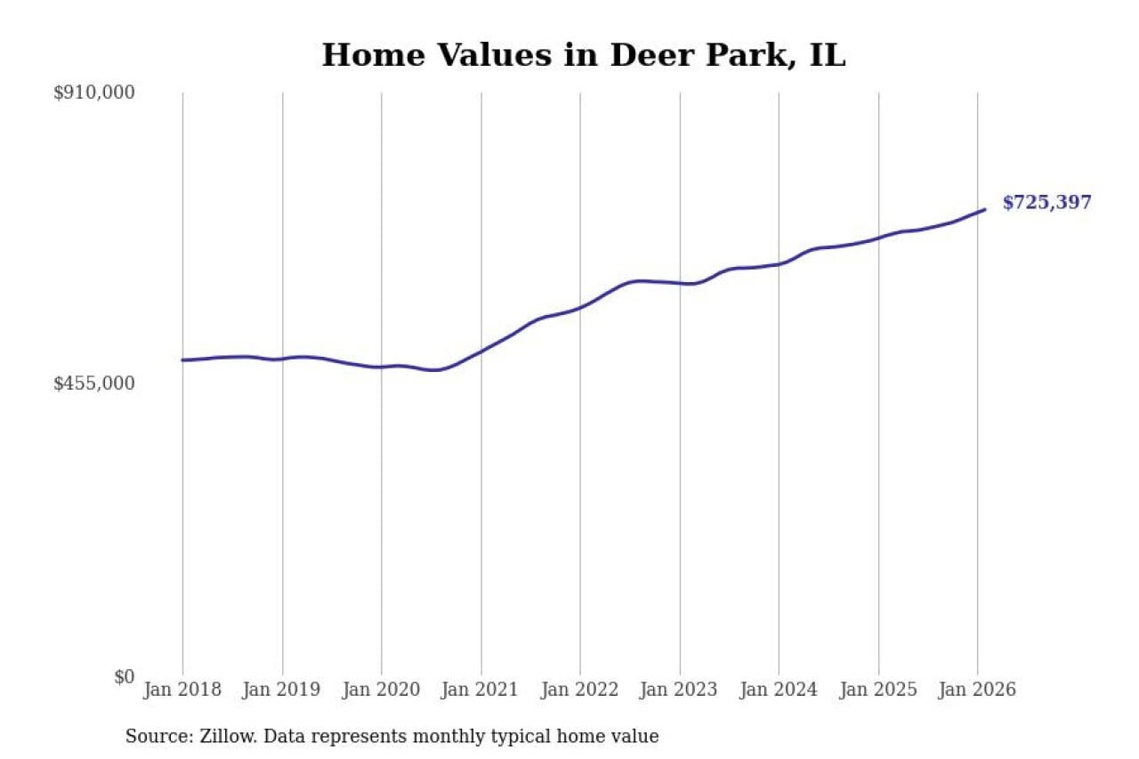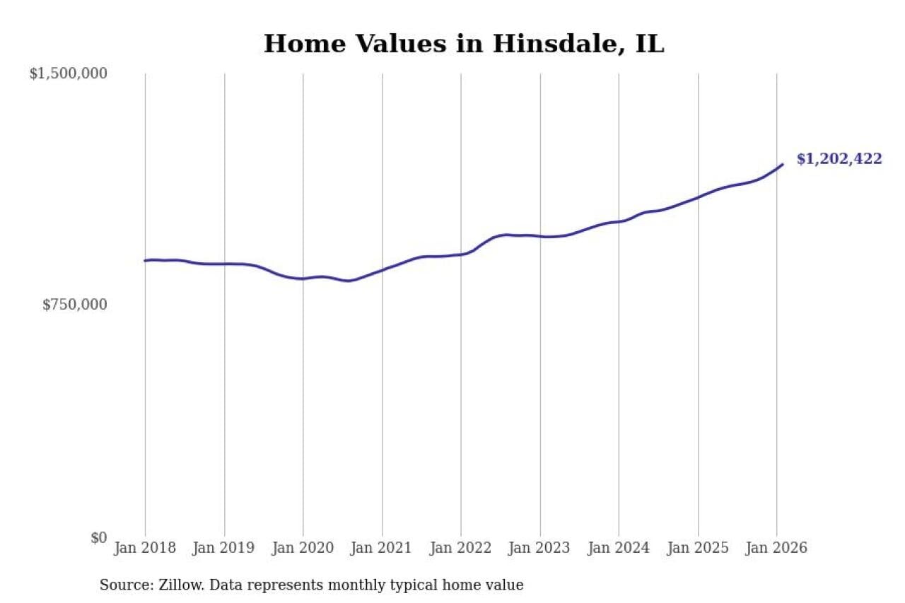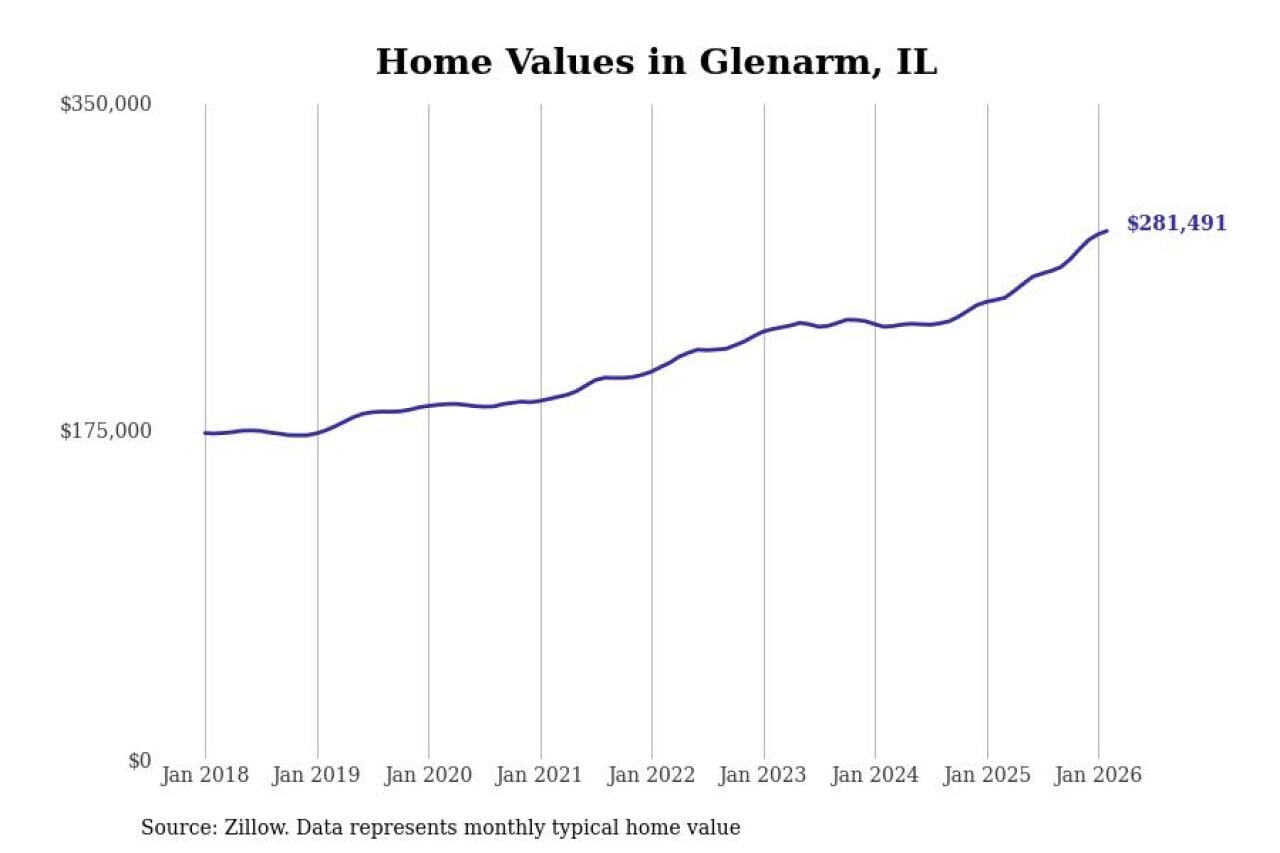 Stacker compiled a list of cities with the fastest-growing home prices in Illinois using data from Zillow. Cities are ranked by the dollar change in the Zillow Home Values Index for all homes from the 12 months ending February 2026. The charts in this story were created automatically using Matplotlib. Data was available for 50 cities and towns in Illinois.