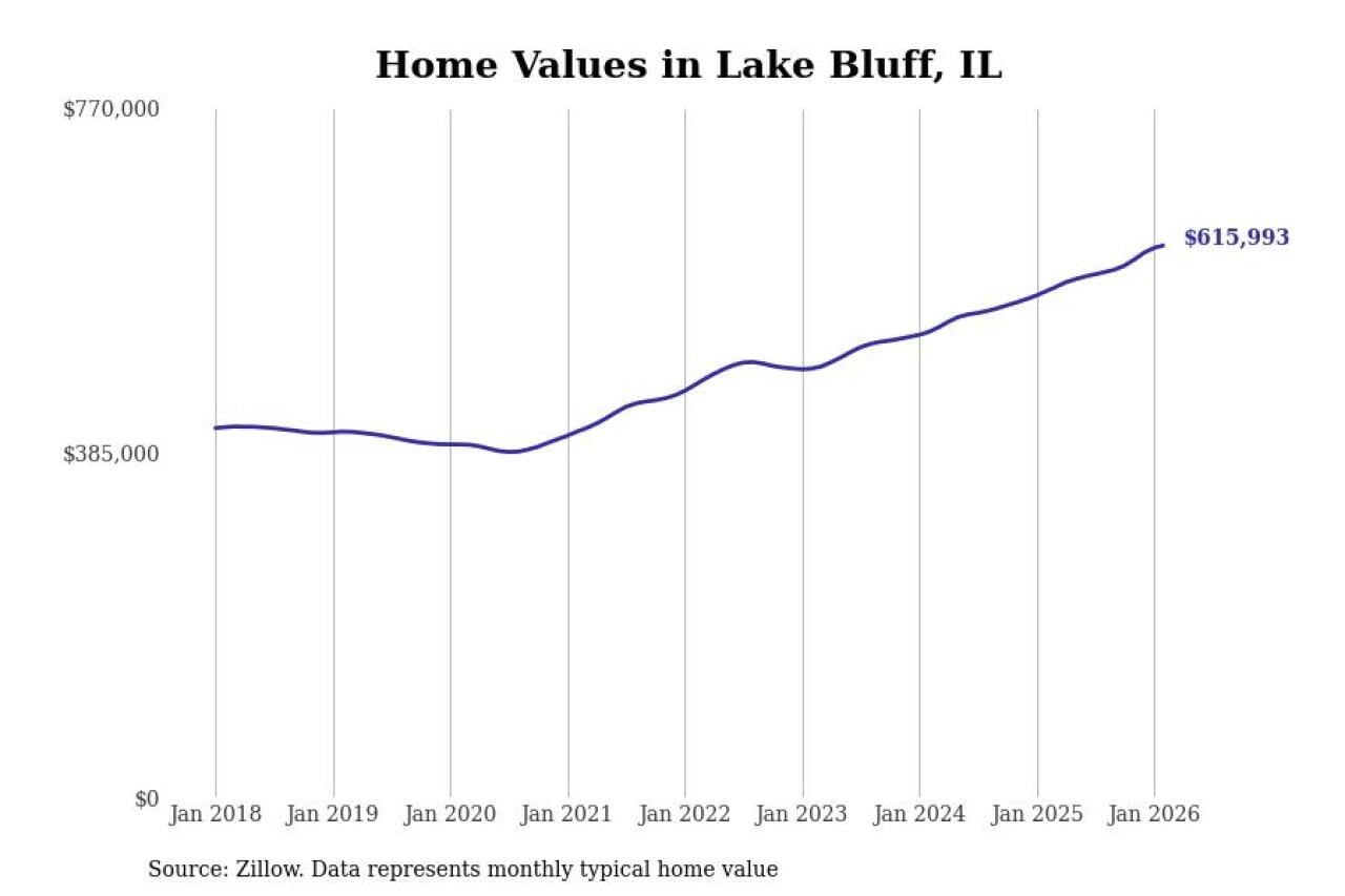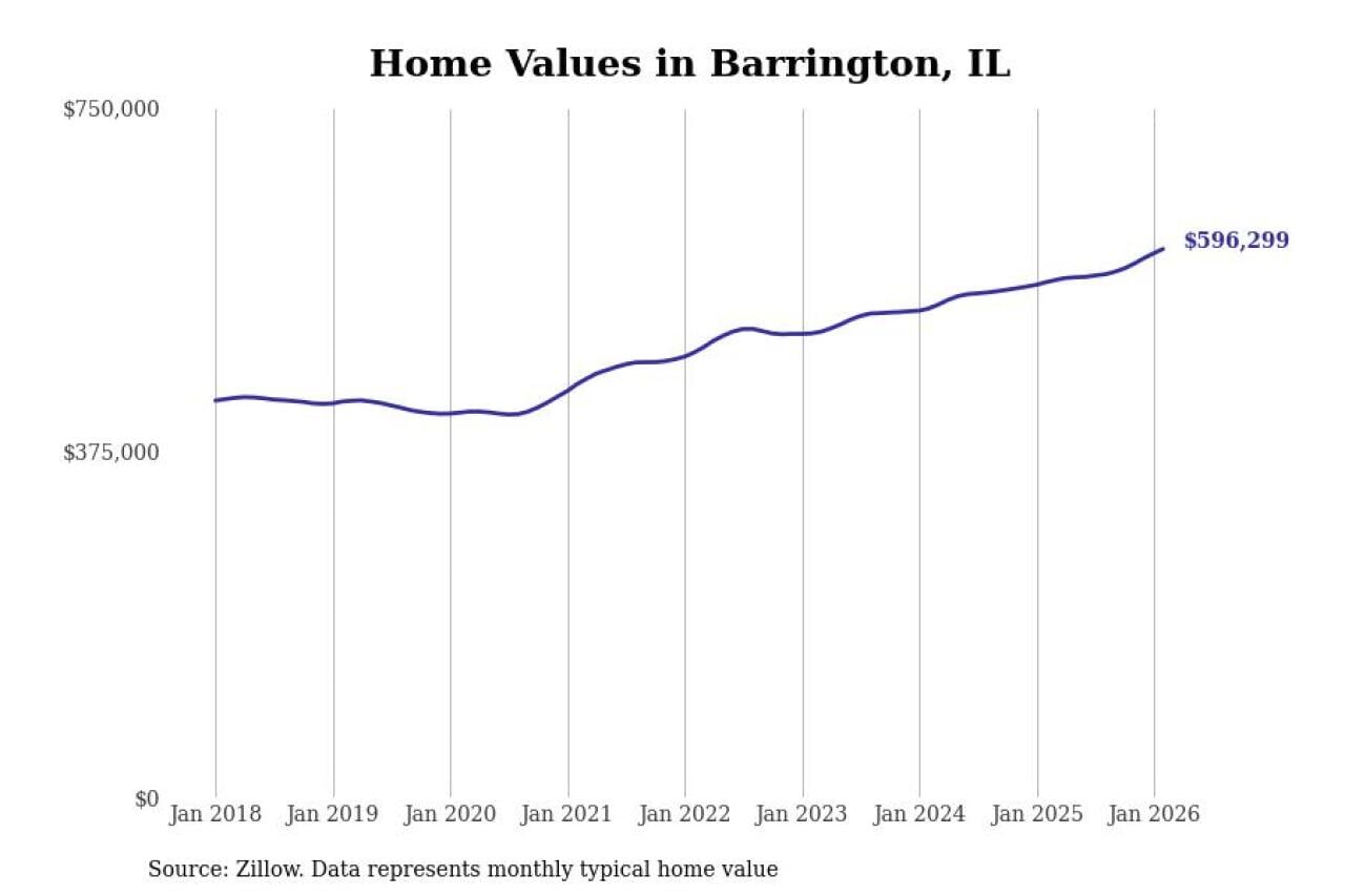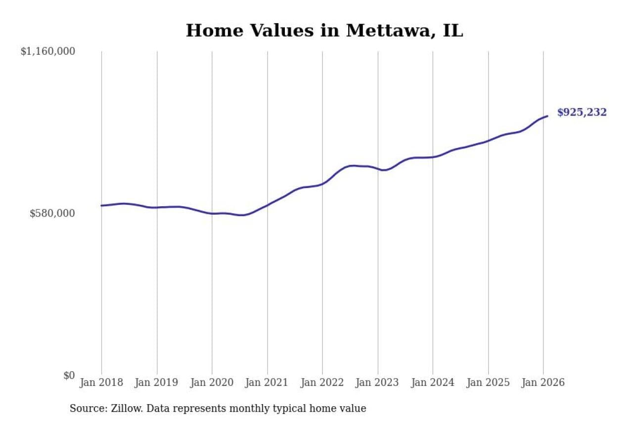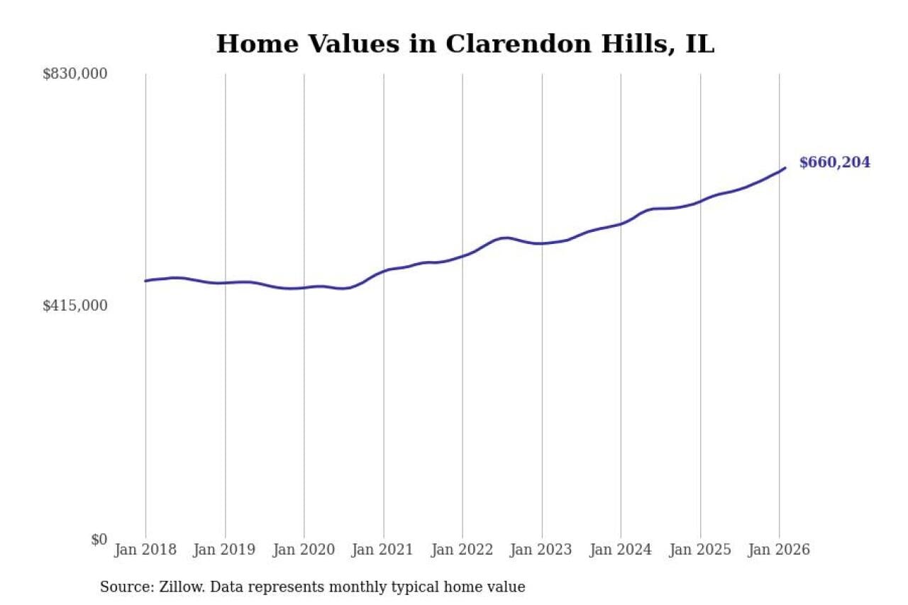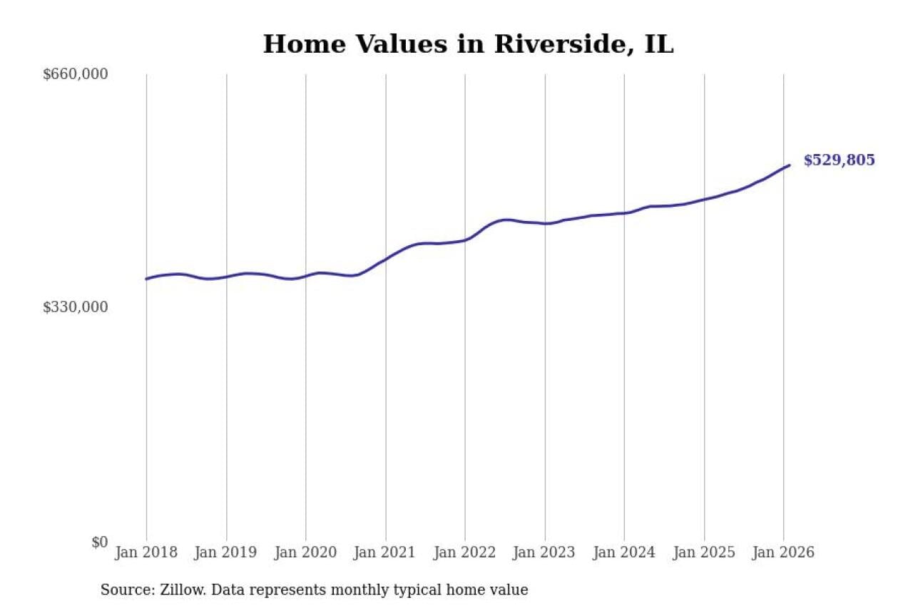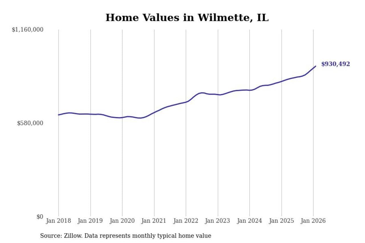 Stacker compiled a list of cities with the fastest-growing home prices in Illinois using data from Zillow. Cities are ranked by the dollar change in the Zillow Home Values Index for all homes from the 12 months ending February 2026. The charts in this story were created automatically using Matplotlib. Data was available for 50 cities and towns in Illinois.