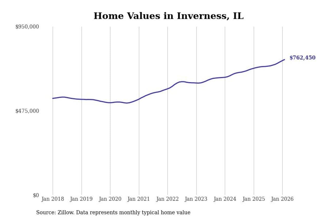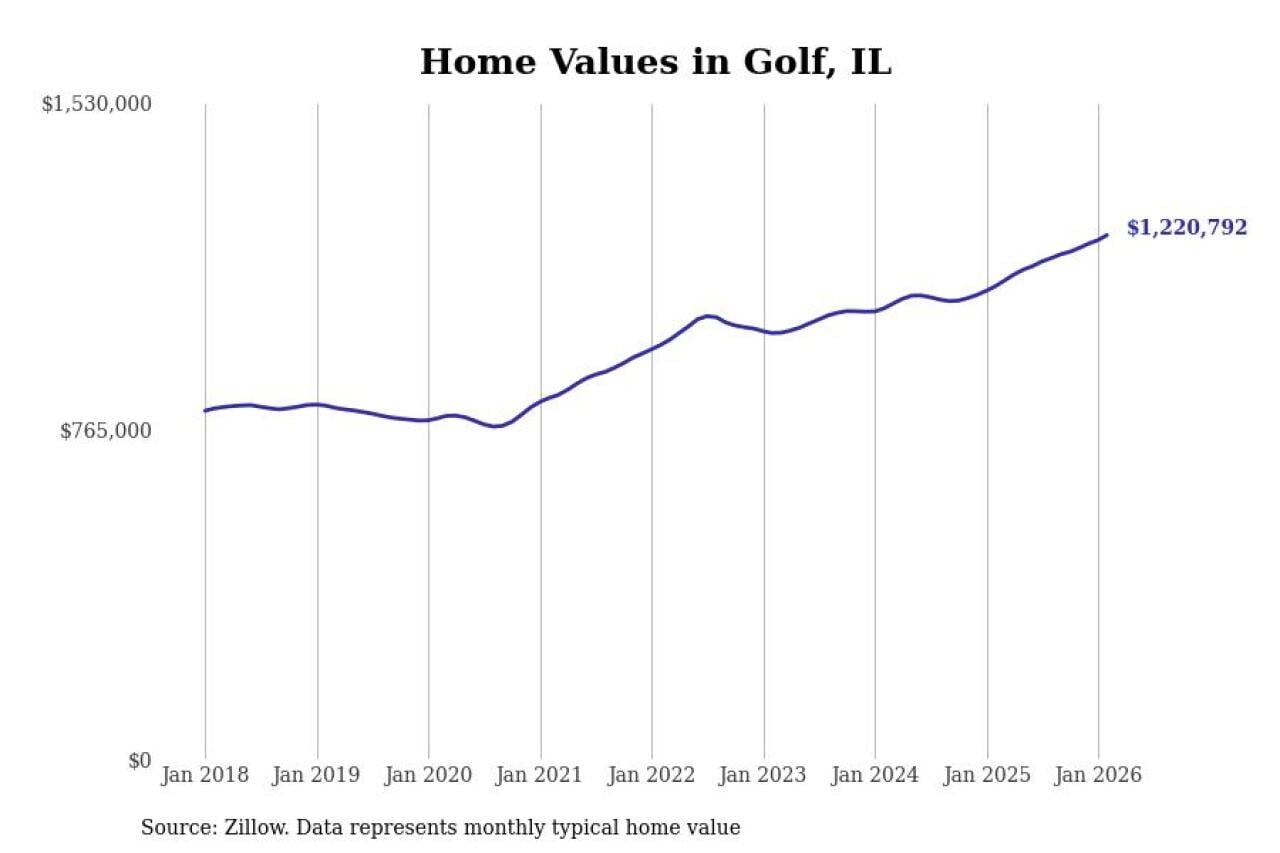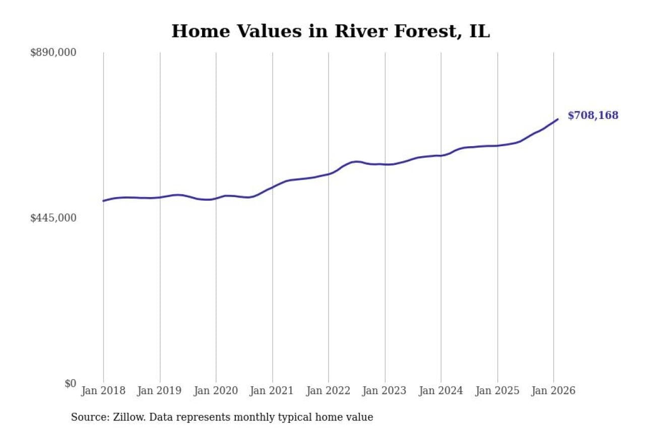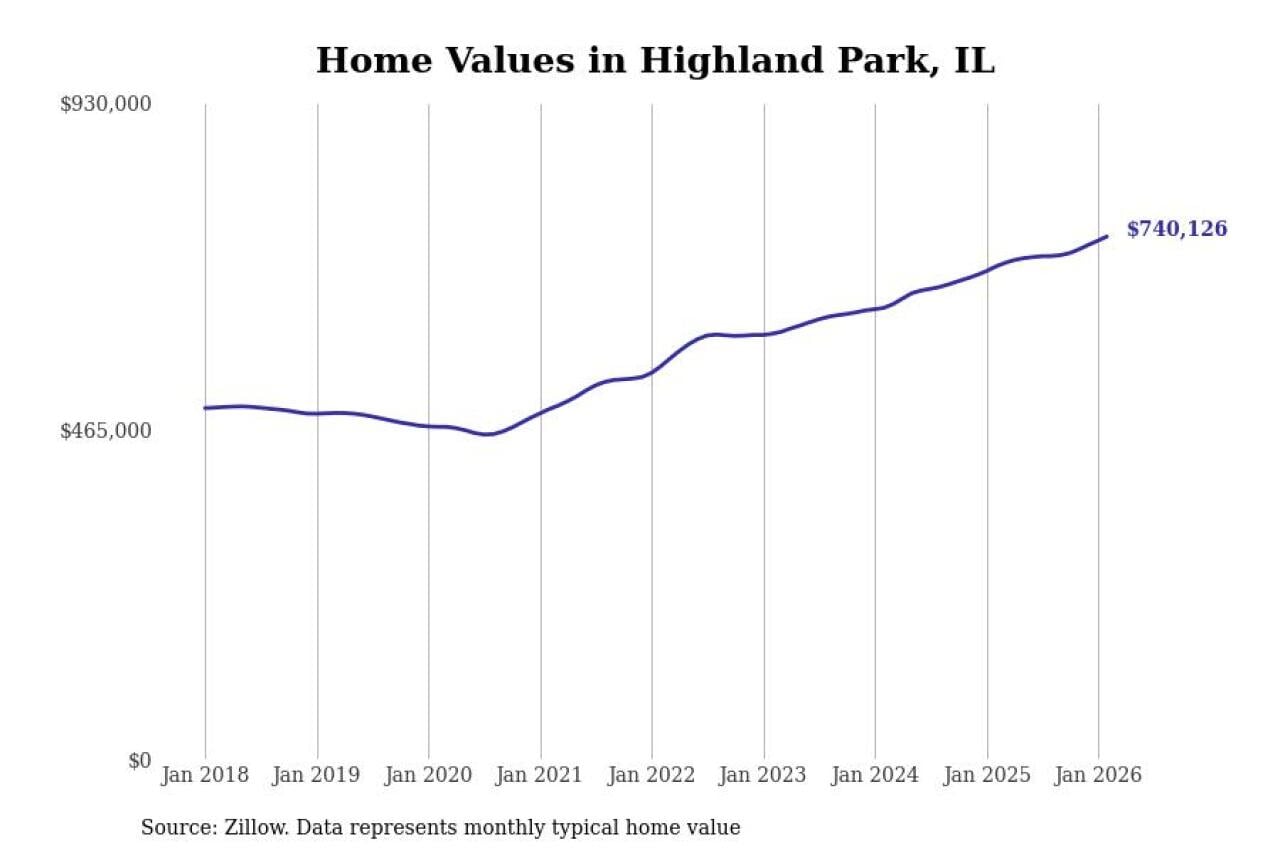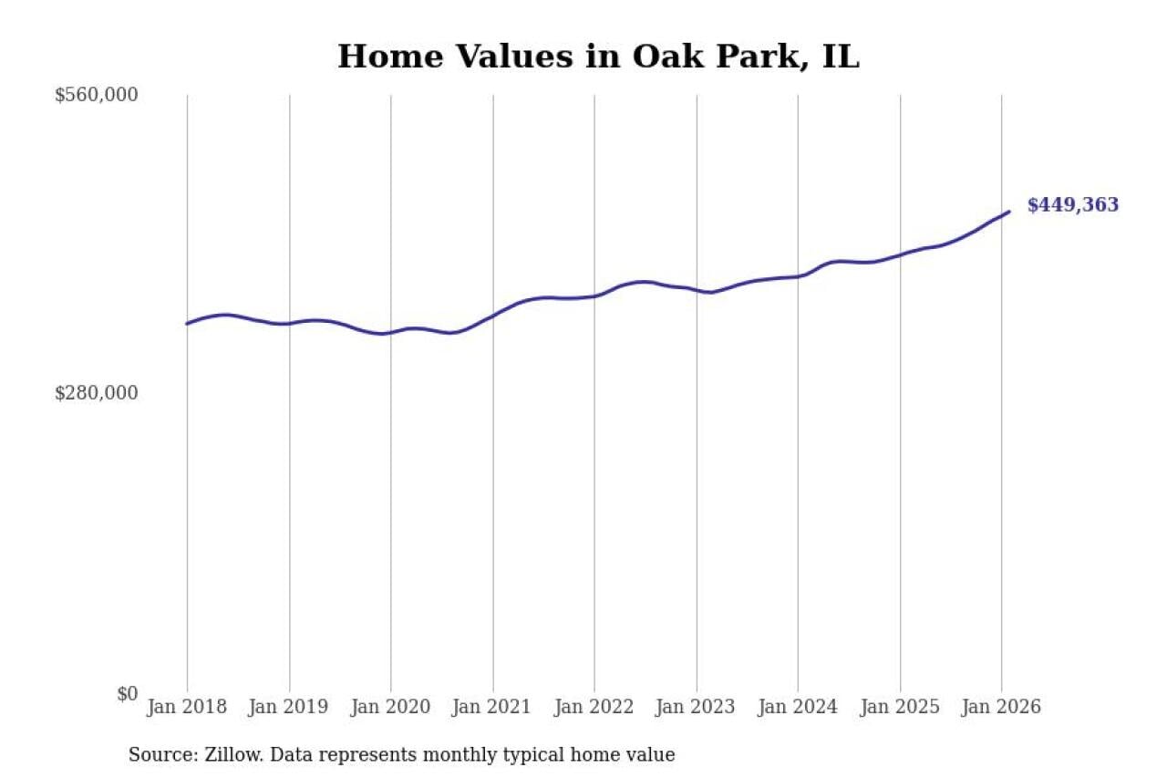Stacker compiled a list of cities with the fastest-growing home prices in Illinois using data from Zillow. Cities are ranked by the dollar change in the Zillow Home Values Index for all homes from the 12 months ending February 2026. The charts in this story were created automatically using Matplotlib. Data was available for 50 cities and towns in Illinois.